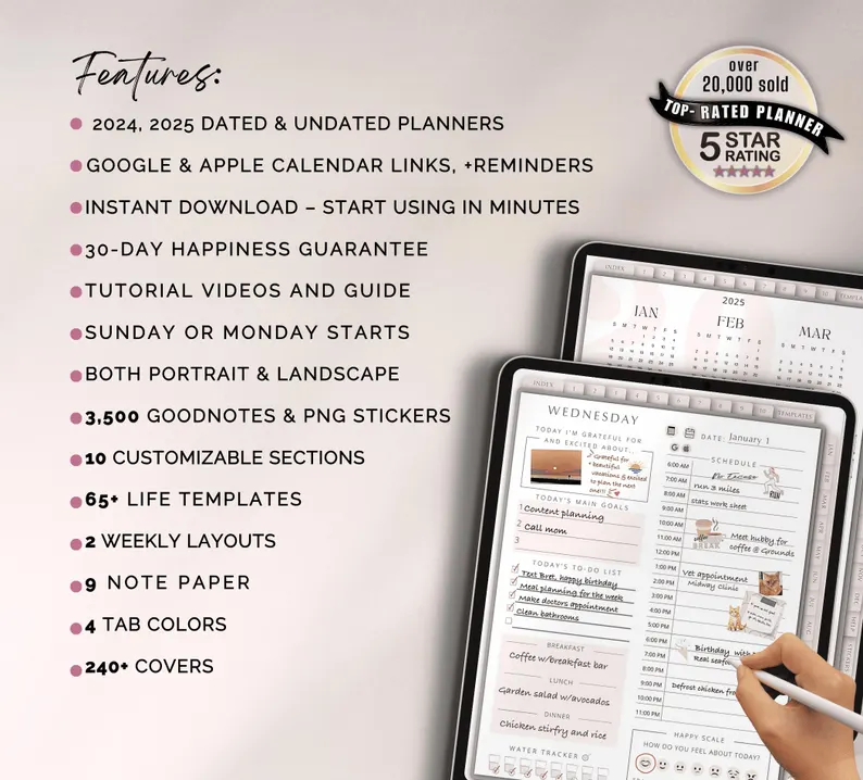 2025 Digital Planner GoodNotes Template for iPad Tablet and Phone with Apple & Google Calendar links Life Journal Daily Weekly and Monthly