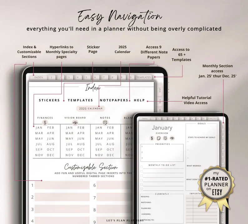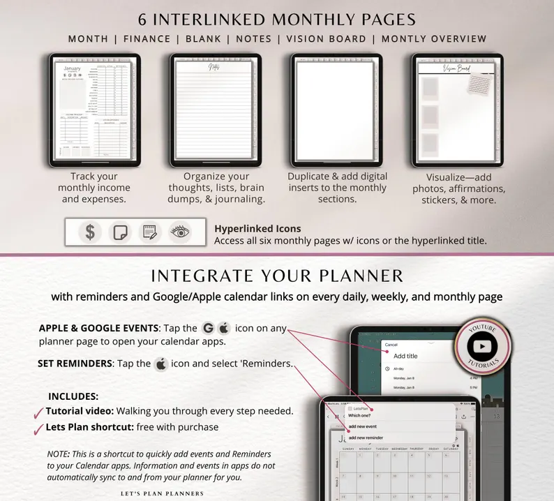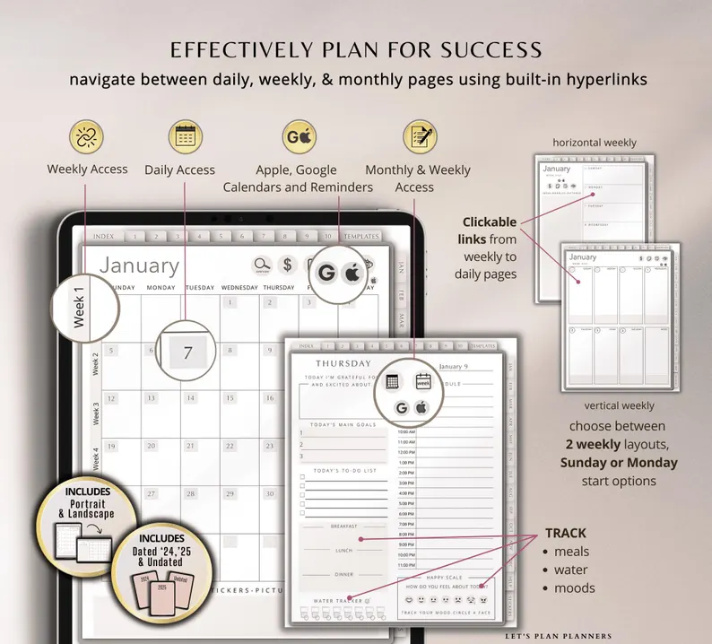 2025 Digital Planner, a versatile template designed for iPads, tablets, and phones. Seamlessly integrate with Apple and Google Calendar links to manage your daily, weekly, and monthly schedules, perfect for a busy lifestyle.