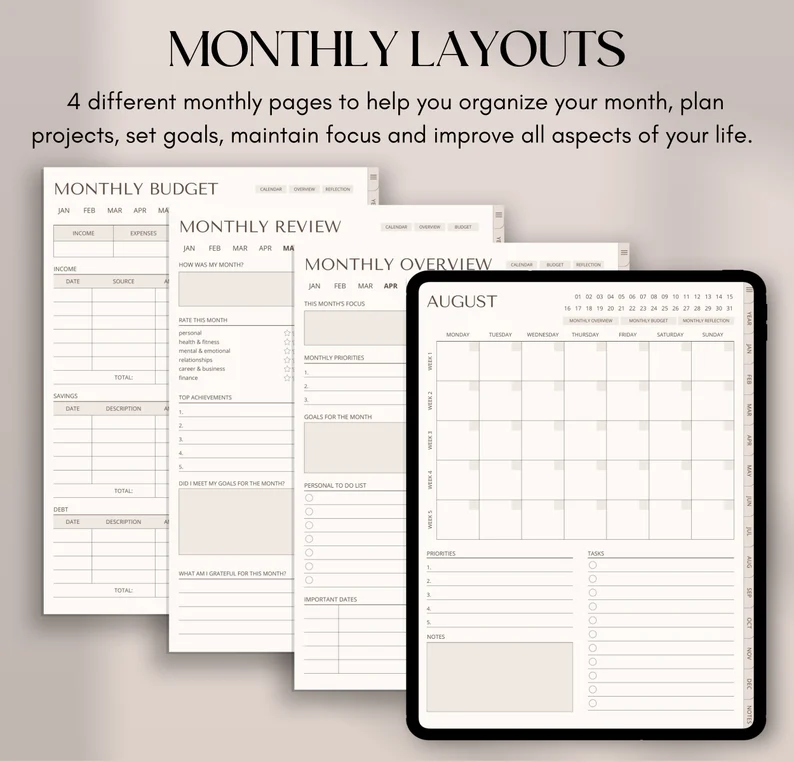The planner has 595 pages of daily, weekly, monthly, quarterly and yearly planners with over 60 unique templates. The bonus templates are designed to help you manage your finances, health and fitness journey, productivity, self-care and much more. Fully hyperlinked for easy navigation and premium, elegant design. With digital planning you can customize your planner to suit your needs. Duplicate or delete templates, create custom notebooks and get creative while be!