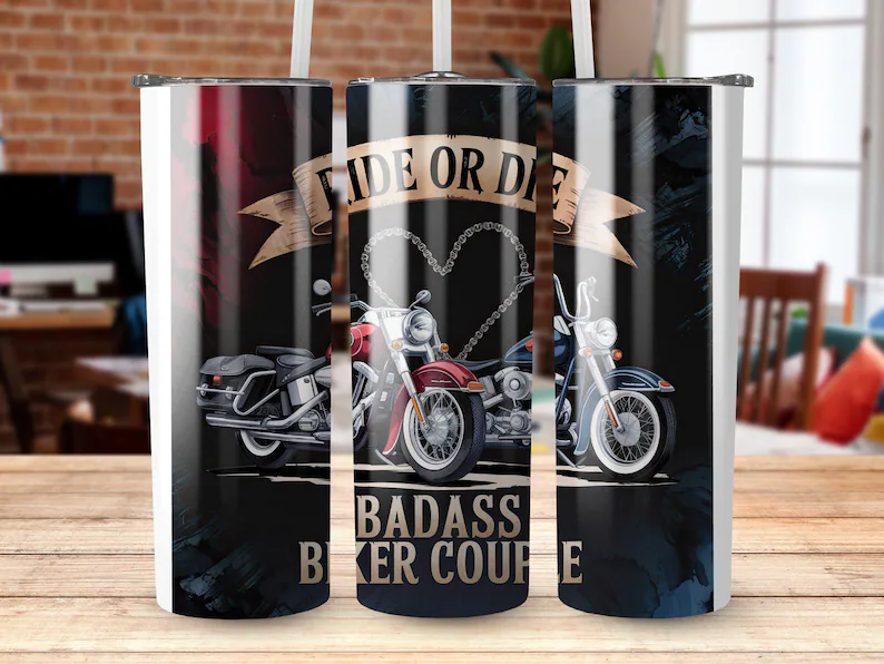 Ride or Die Badass Biker Couple Digital Tumbler 20oz Straight Tapered Commercial Use